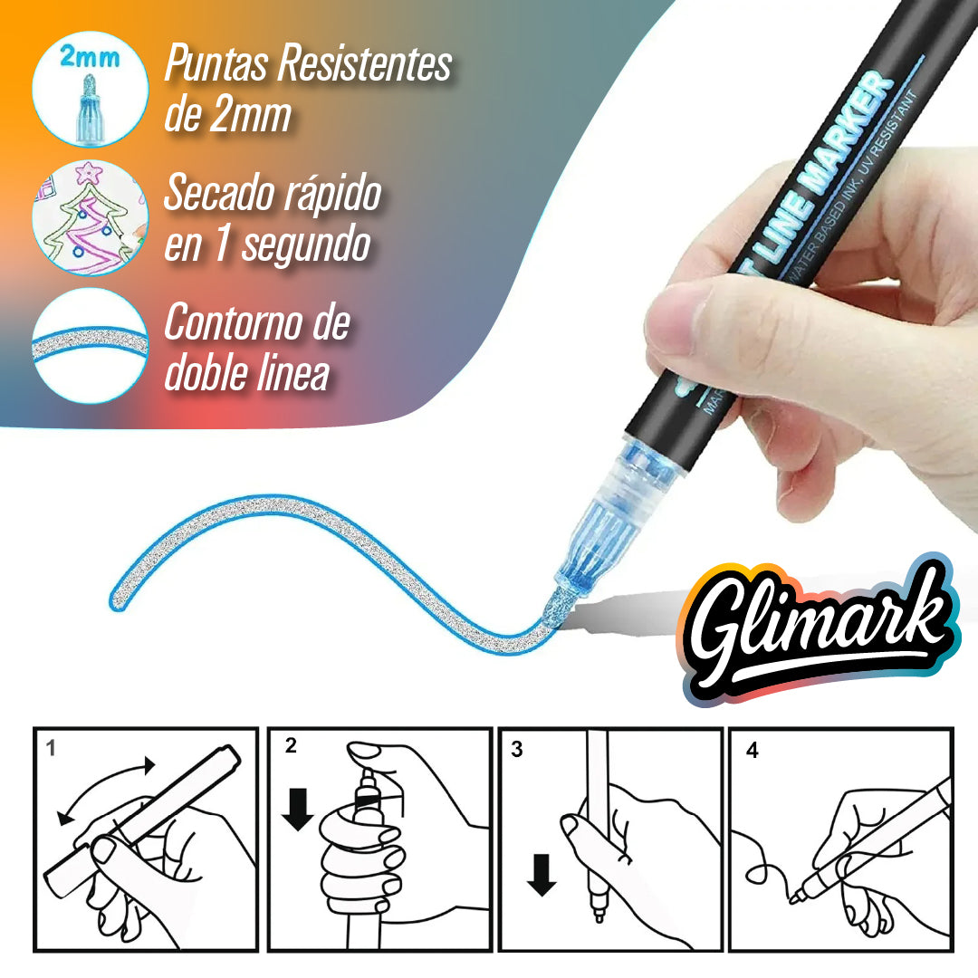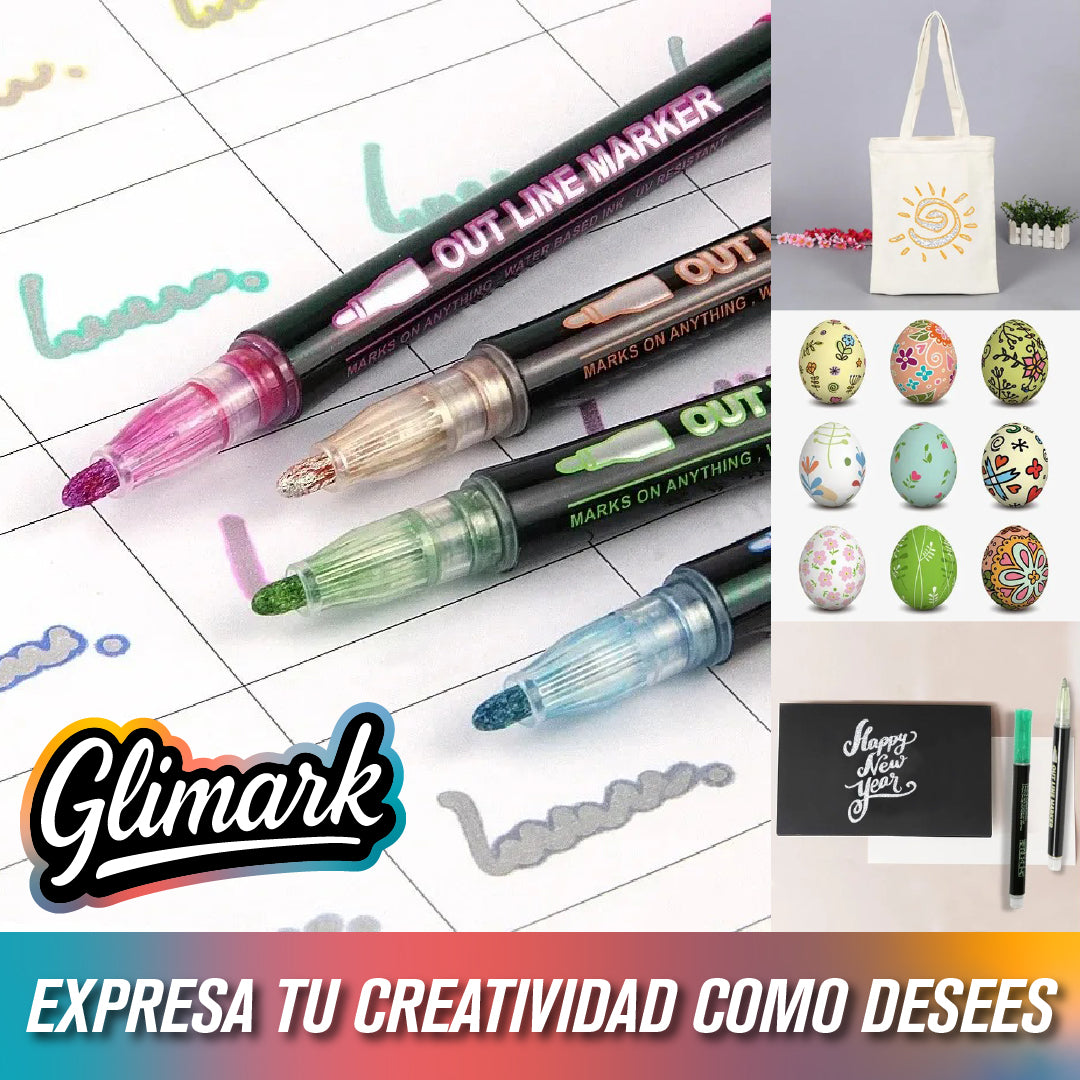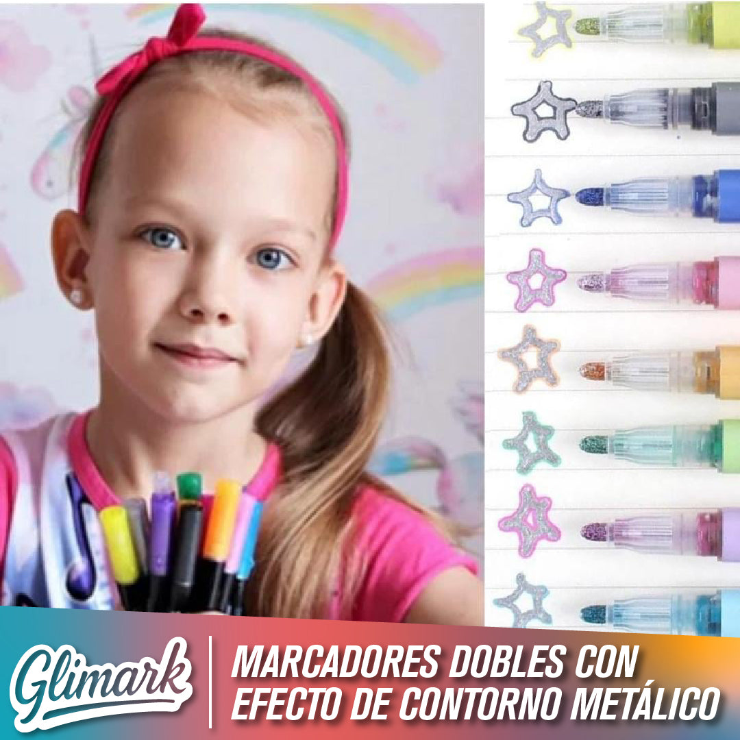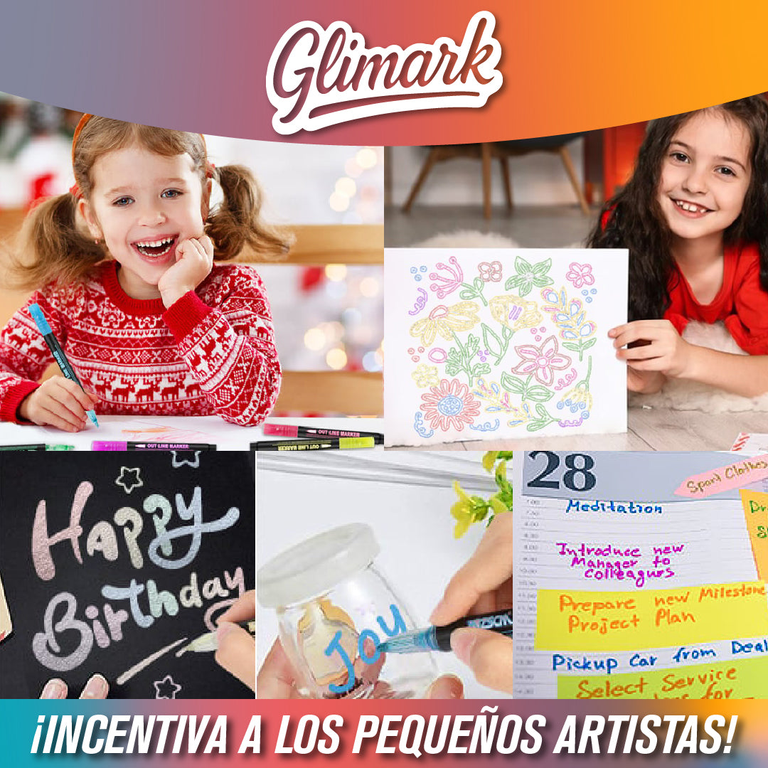 Glimark™ trae 8 lápices con tonos únicos que brillan y se destacan en cualquier superficie. ¿Estudiás diseño? ¿Haces Lettering o decorás planners? Con su doble punta, tinta brillante y efecto de contorno automático, estos lapices llevan tus ideas al siguiente nivel.
