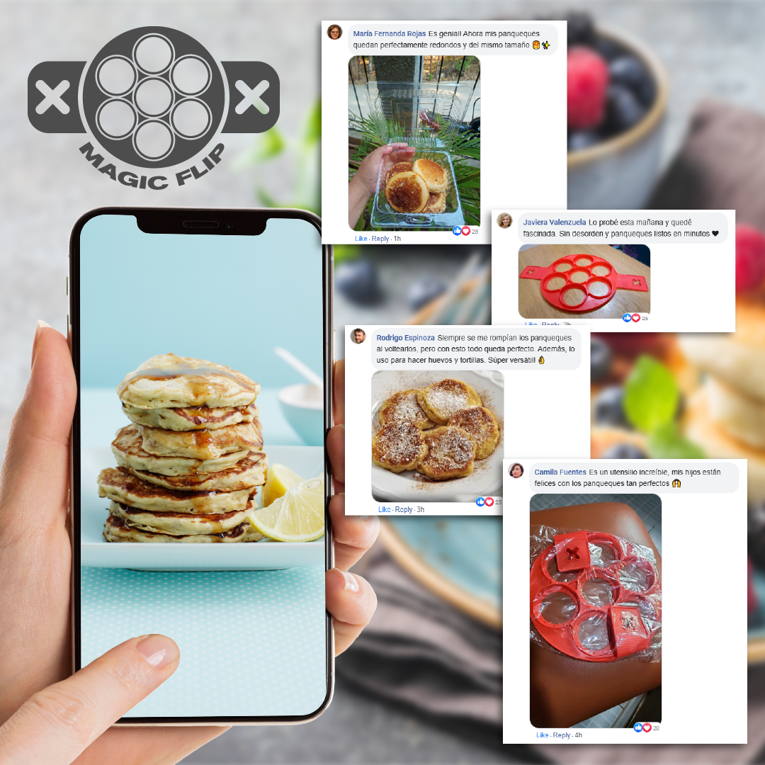 ¿Frustrado con preparar panqueques desiguales? Magic Flip te permite preparar panqueques perfectamente redondos y uniformes cada vez, sin complicaciones ni ensuciar tu cocina. Transforma tus desayunos en momentos memorables con facilidad y precisión.